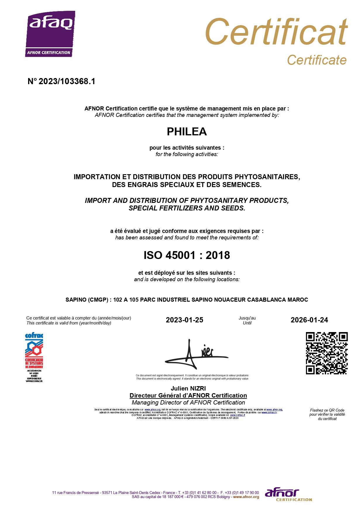 Aujourd’hui, nous affirmons notre engagement à consolider, à pérenniser et à améliorer en continue notre démarche QSE. Pour l’avenir de notre entreprise, nous demandons à l’ensemble du personnel d’apporter sa participation active, d’adhérer à la culture qualité afin d’atteindre nos objectifs et satisfaire en permanence nos parties intéressées. Directeur Général